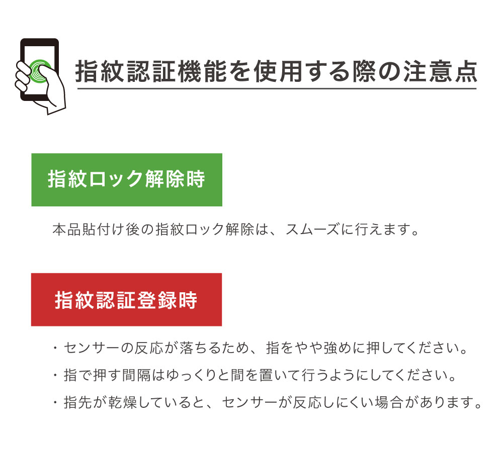 画面内指紋認証対応フィルム 本品貼付け後の指紋ロック解除は、スムーズに行えます。 【指紋認証登録をする際のご注意点】 |