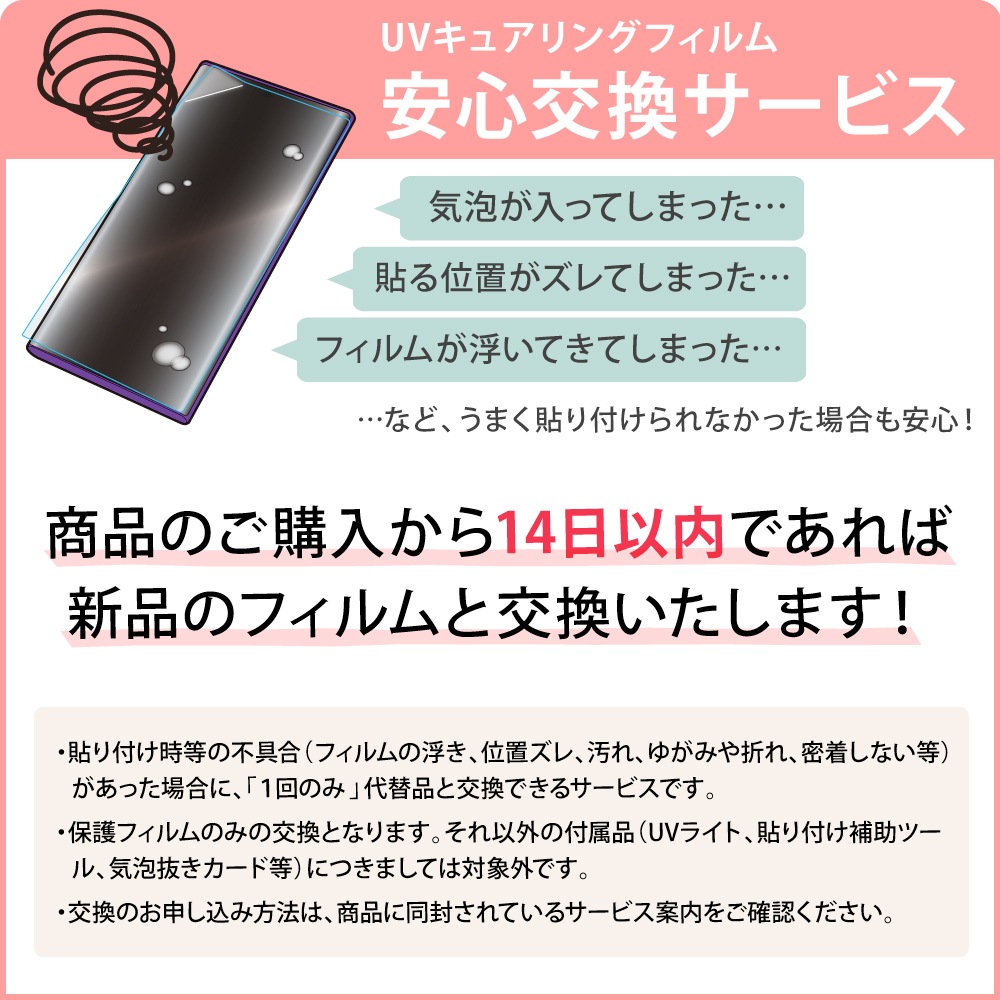 | 保証 | ■あんしん交換サービス UVキュアリングフィルムに貼付け時等に不具合などがあった場合、新品にお取り替えいたします。 ●保証範囲 貼付け時等の不具合(例:フィルムの浮き、位置ズレ、汚れ、ゆがみ、折れ、密着しない等) ●保証内容 保証期間内で、一回のみ代替品をお送りします。 ※保護フィルムのみの交換となります。UVライト等の付属品は対象外のため、お手元に保管してください。 ●保証期間 ご購入日から14日以内 ●交換受付フォーム 商品に同封されている、安心交換サービスの紙をご参照ください。 |