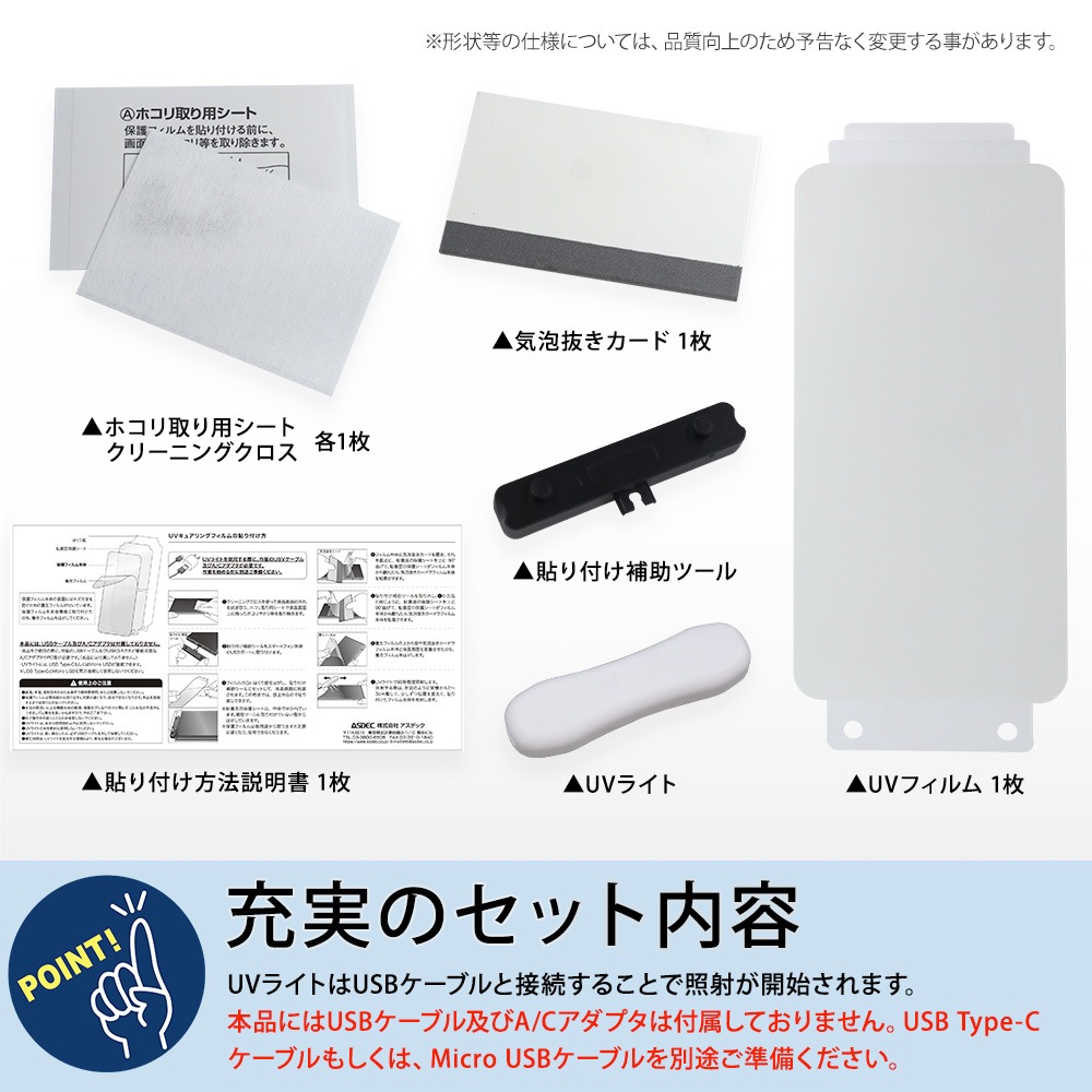 ・メインディスプレイ用UVフィルム 1枚 ・UVライト 1個 ・貼り付け補助ツール 1個 ・気泡抜きカード 1個 ・クリーニングクロス(白い不織布) 1枚 ・ホコリ取りシート 1枚 ・貼り付け方法説明書 1枚 |