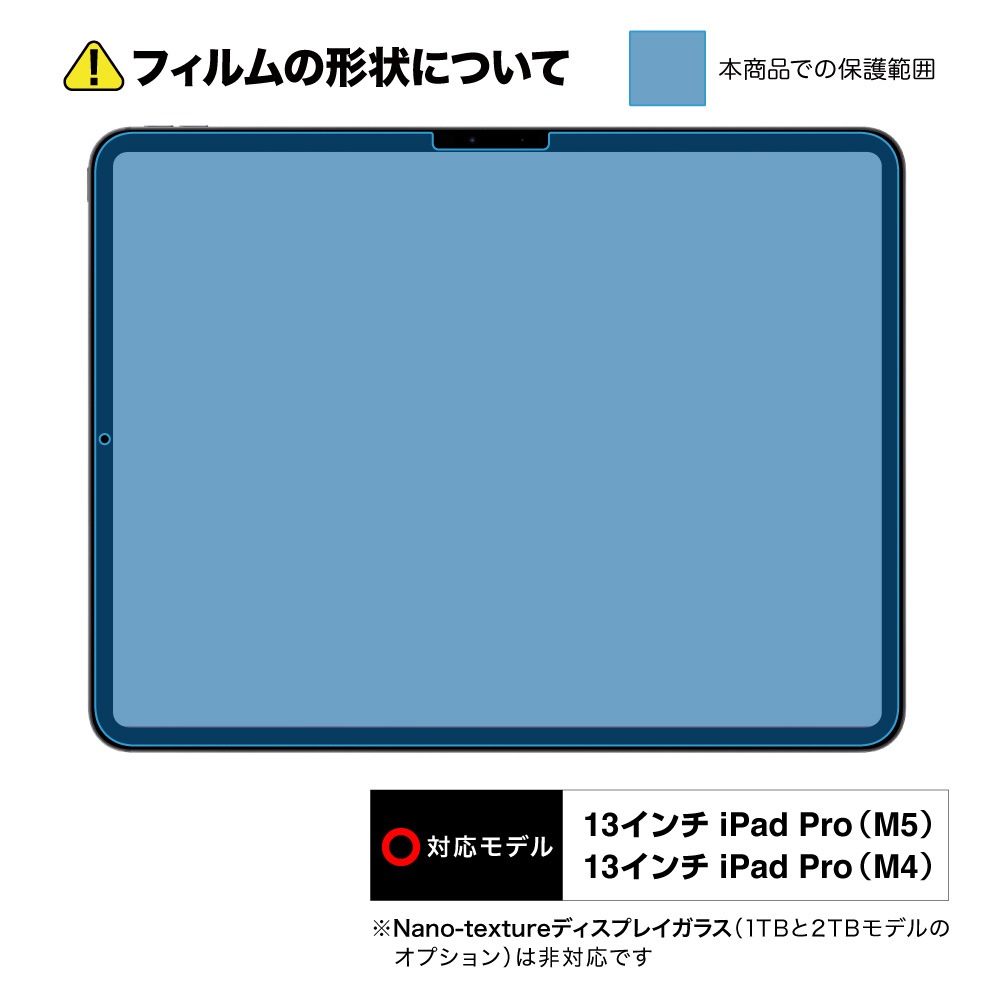 Apple iPad Pro 13インチ (M5) Apple iPad Pro 13インチ (M4) 【フィルムの形状について】画像3枚目を参照 ※光・近接センサーがインカメラ周りと左端にあり、誤作動を防ぐためセンサー部を避ける形状となっております。 【ご注意点】 1TBと2TBのオプションで選べる「Nano-texture ディスプレイガラス」には対応しておりません(非対応です)。 |