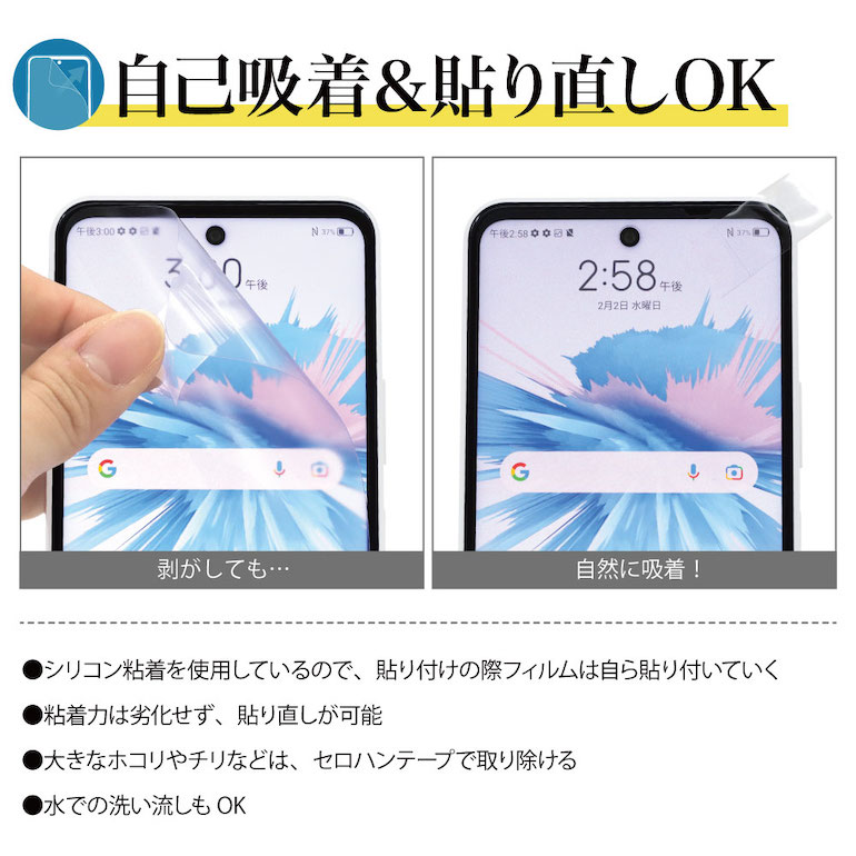 | 注意事項 | ※2,500円未満は代金引換不可 ※1日程度で気泡が消失しない場合、指の腹で気泡を押しつぶす様に上下左右に優しく擦ると消失する場合があります。 大きめのホコリがはさまって気泡ができている場合は、セロハンテープなどでホコリを取り除いてください。 ※メインディスプレイ用以外はノングレアフィルム3ではありません。 ※記載されている商品名、会社名は各社の商標または商標登録です。 ※フィルムの形状等の仕様については、品質向上のため予告なく変更する事があります。 ※フィルムのイラストはイメージです。 ※比較画像は全て実写です。 |